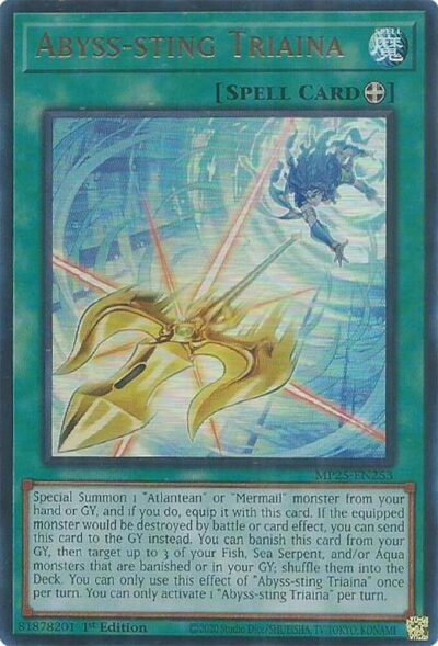 Special Summon 1 “Atlantean” or “Mermail” monster from your hand or GY, and if you do, equip it with this card. If the equipped monster would be destroyed by battle or card effect, you can send this card to the GY instead. You can banish this card from your GY, then target up to 3 of your Fish, Sea Serpent, and/or Aqua monsters that are banished or in your GY; shuffle them into the Deck. You can only use this effect of “Abyss-sting Triaina” once per turn. You can only activate 1 “Abyss-sting Triaina” per turn.