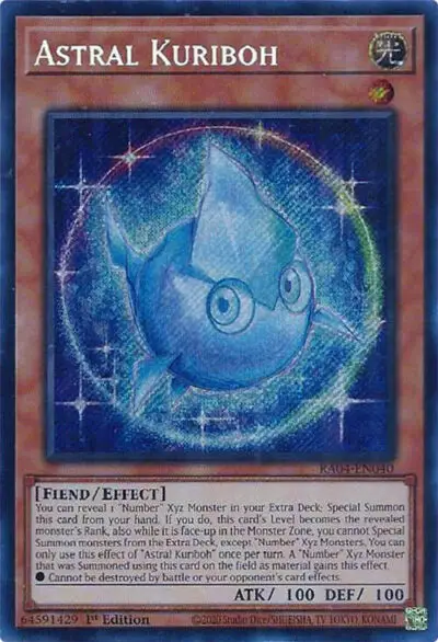 You can reveal 1 “Number” Xyz Monster in your Extra Deck; Special Summon this card from your hand. If you do, this card’s Level becomes the revealed monster’s Rank, also while it is face-up in the Monster Zone, you cannot Special Summon monsters from the Extra Deck, except “Number” Xyz Monsters. You can only use this effect of “Astral Kuriboh” once per turn. A “Number” Xyz Monster that was Summoned using this card on the field as material gains this effect.