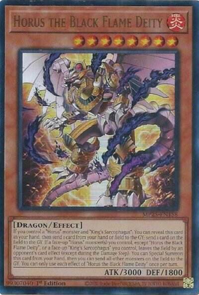 If you control a «Horus» monster and «King’s Sarcophagus»: You can reveal this card in your hand, then send 1 card from your hand or field to the GY; send 1 card on the field to the GY. If a face-up «Horus» monster(s) you control, except «Horus the Black Flame Deity», or a face-up «King’s Sarcophagus» you control, leaves the field by an opponent’s card effect (except during the Damage Step): You can Special Summon this card from your hand, then you can send all other monsters on the field to the GY. You can only use each effect of «Horus the Black Flame Deity» once per turn.